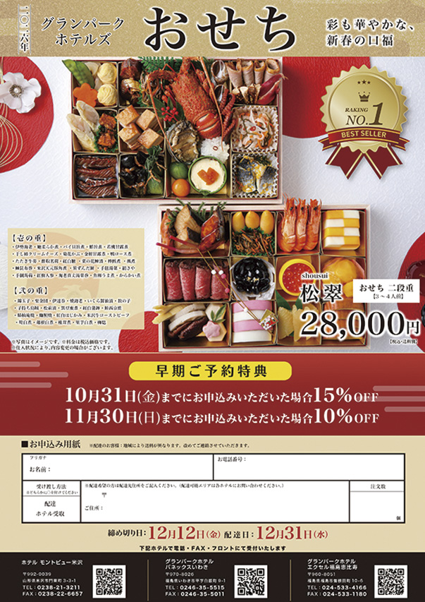 平字白銀町、グランパークホテルパネックスいわきは、毎年恒例のおせち料理の予約を受け付け中。